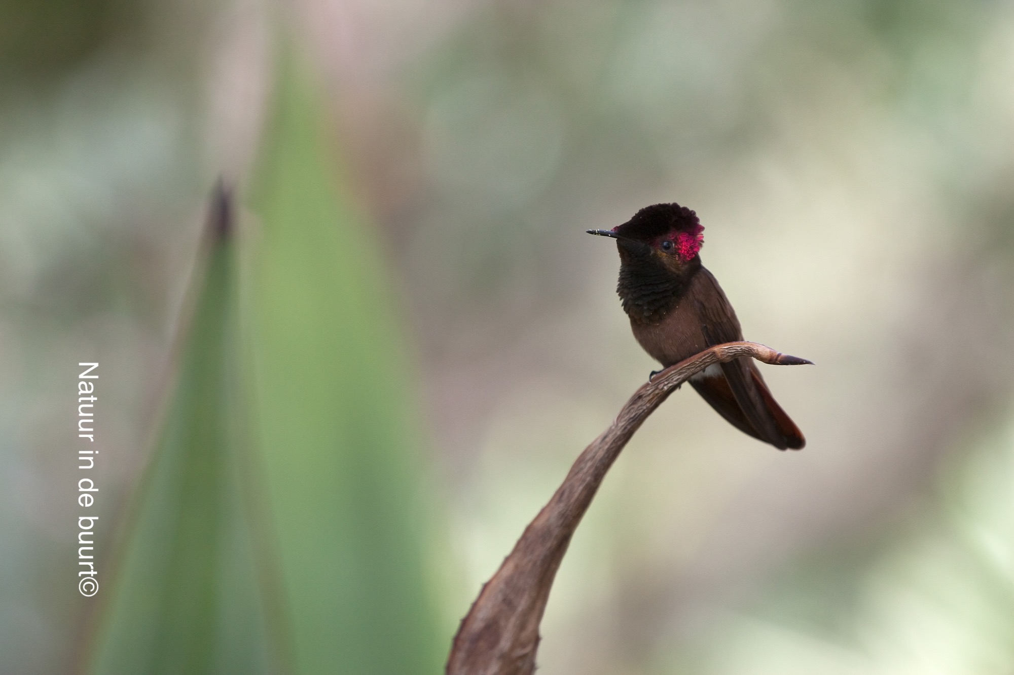 Op Bonaire leeft naast groene kolibrie ook de rode. Deze is wat groter. Hier een dode punt van een agave als uitvalsbasis.