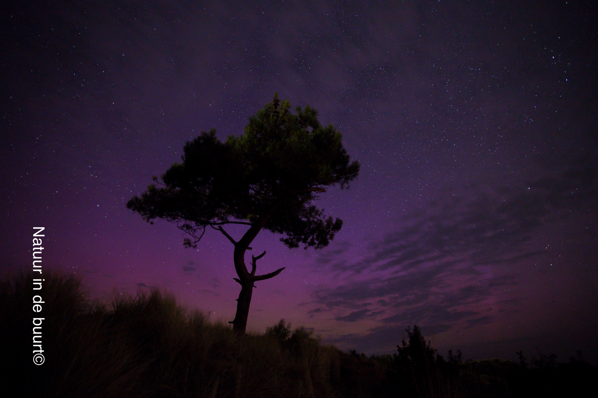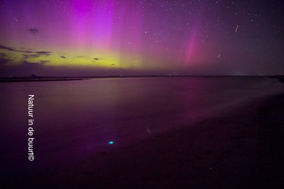 De lichtgevende kwal bleef op z’n plek liggen tijdens het maken van dit beeld. Het noorderlicht deed de rest.